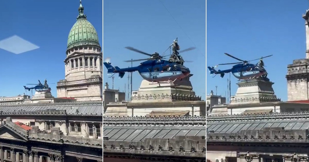 Fue un simulacro de la Policía Federal que buscó medir tiempos de traslado. La imagen de la aeronave volando bajo llamó la atención de los transeúntes a la hora del almuerzo.